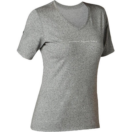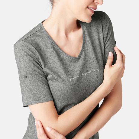 T-shirt voor pilates/lichte gym dames 500 regular fit neps grijs met print