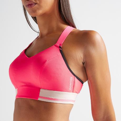 Deze sportbeha 500, met GEMIDDELDE ONDERSTEUNING*, is geschikt voor fitnessactiviteiten met gemiddelde impact (dans-workouts, cardiotraining, crosstraining). De zachte en elastische bandjes, de luchtige cups en de elastische onderbusteband garanderen een heel goede ondersteuning en veel draagcomfort. * vermindert schokken met 45% t.o.v. een gewone beha bij activiteiten met MEDIUM IMPACT.